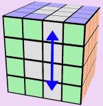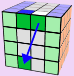 Spin the third column until you can position the next piece (Green/White) next to the Green/Blue piece as shown. This piece actually belongs below the Green/Blue piece (also shown) and this following procedure will move it there.